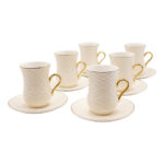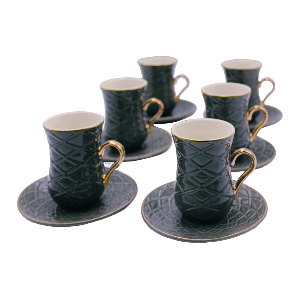 يتميز كل كوب بتصميم هندسي محفور بعناية يبرز فخامة التفاصيل ودقة الصنع، بينما تضفي الحواف والمقابض الذهبية لمسة من الرقي والترف على كل قطعة.
