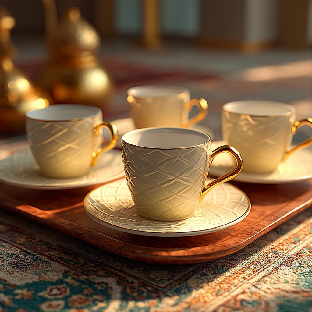 Yüksek kaliteli porselenden üretilmiş, zarif geometrik desenli ve altın detaylarla süslenmiş şık bir Türk kahve takımı.